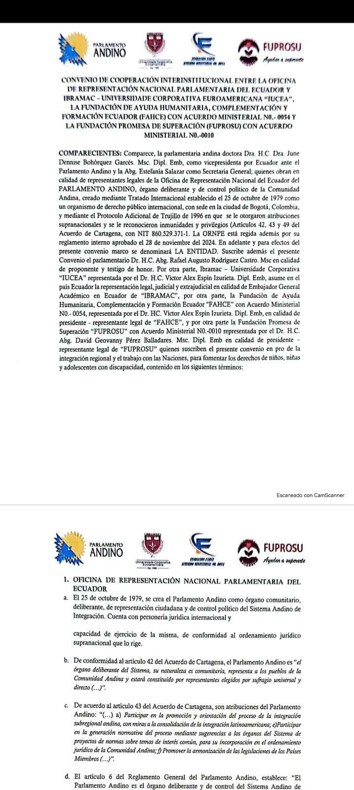 CONVENIO MARCO DE COOPERACIÒN INTERINSTITUCIONAL ENTRE IBRAMAC - UNIVERSIDADE CORPORATIVA EUROAMERICANA "IUCEA", EL PARLAMENTO ANDINO CON PERSONERIA JURÌDICA INTERNACIONAL Y ORDENAMIENTO JURÌDICO SUPRANACIONAL, FUNDACIÒN DE AYUDA HUMANITARIA, COMPLEMENTACIÒN Y FORMACIÒN ECUADOR "FAHCE" CON ACUERDO MINISTERIAL N0.- 0054, Y FUNDACIÒN PROMESA DE SUPERACIÒN "FUPROSU" CON ACUERDO MINISTERIAL N0.- 0010
