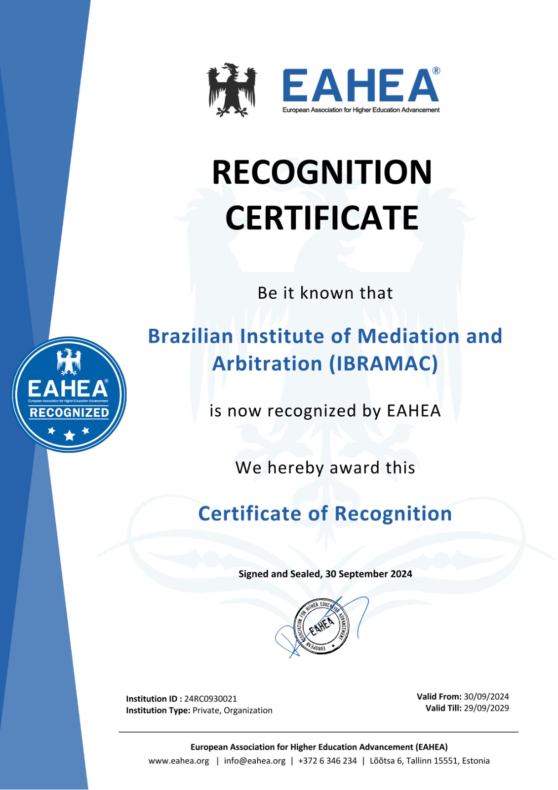 Nos complace informarles que el Instituto Brasileño de Mediación y Arbitraje (IBRAMAC) ha sido reconocido oficialmente por la Asociación Europea para el Logro de la Educación Superior. Este reconocimiento significativo pone de relieve la dedicación continua de IBRAMAC a la excelencia en la educación, especialmente en las áreas de la mediación y el arbitraje.